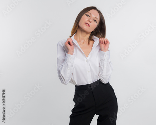 Portrait of elegantly young blond hair woman dressed in white shirt. Business woman smiling, successful looking at camera isolated on gray background. Studio shot, copy space