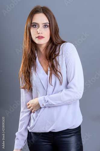 Portrait of Emily, wearing a lilac shirt. Shot against a grey background.