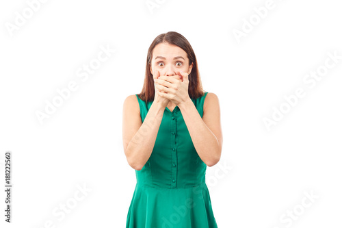 Portrait of emotional young woman in emerald green dress on white background