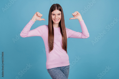 Portrait of energetic positive cheerful girl point thumb finger herself impressed wear good look clothes isolated over blue color background