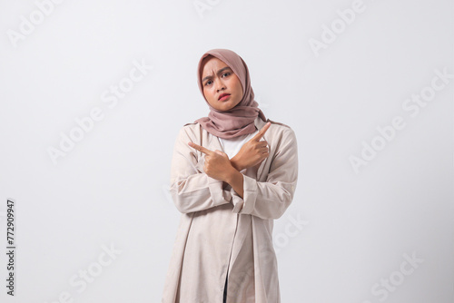 Portrait of excited Asian hijab woman in casual suit spreading hands making choice, choosing between two objects. Businesswoman concept. Isolated image on white background