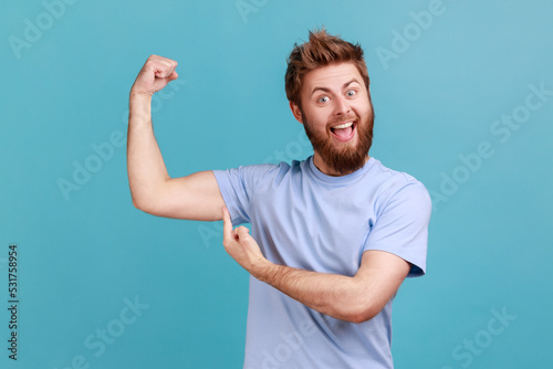 Portrait of excited bearded man pointing finger on his arm muscle, pumping in gym, discount, looking at camera with satisfied face. Indoor studio shot isolated on blue background.