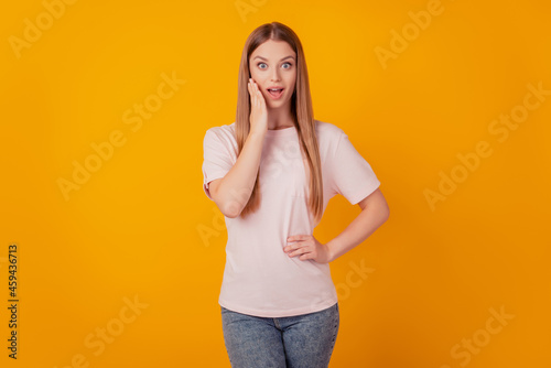 Portrait of excited girlish sweet lady palm cheekbone amazed reaction on yellow background