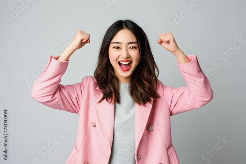 Portrait of excited happy young Asian woman isolated on white background. Studio shot, copy space