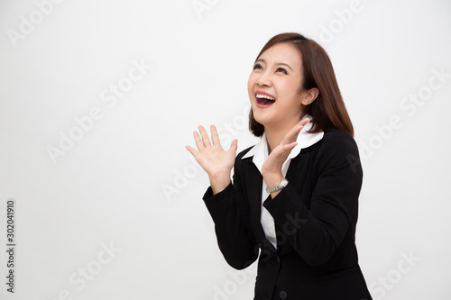 Portrait of excited screaming young asian businesswoman standing in business formal suit isolated over white background, Wow and surprised business woman concept