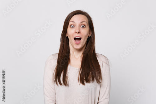 Portrait of excited surprised young woman in light clothes looking camera keeping mouth wide open isolated on white background in studio. People sincere emotions lifestyle concept. Mock up copy space.
