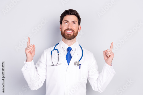 Portrait of experienced doctor man look indicate fingers up empty space wear white coat isolated on grey color background