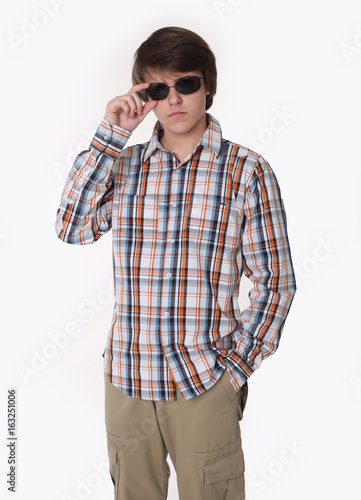 Portrait of fashion man posing in checked shirt and black sunglasses. Handsome guy in street clothes isolated on studio white background.