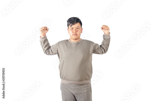 Portrait of fatty boy shows his muscles, concept healthy and exercise isolated on white background