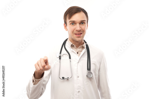 Portrait of friendly positive young male doctor in white medical coat chooses you, points finger at camera isolated on white background.