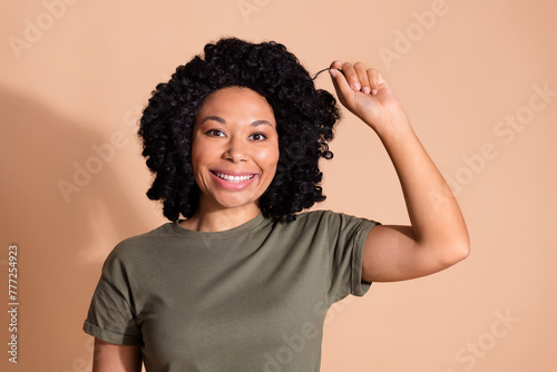 Portrait of funky positive person with perming coiffure dressed khaki t-shirt hand hold curl smiling isolated on pastel color background