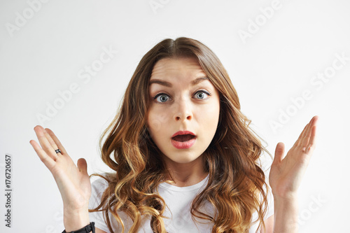 Portrait of funny astonished young European woman with wavy hair expressing genuine surprise and shock with hands, staring at camera with eyes popped out and mouth opened, feeling lost for words
