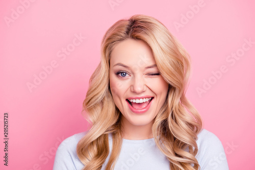 Portrait of funny foolish girl with modern hairdo winking with one eye open mouth, playing with lover isolated on pink background