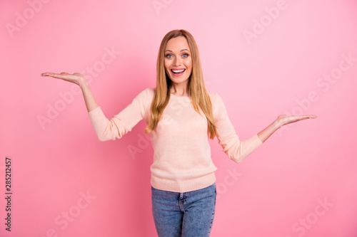 Portrait of funny funky girl impressed unbelievable novelty scream wear denim jeans isolated over pink background