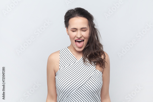 Portrait of funny positive brunette woman standing with closed eyes, showing tongue out, demonstrates childish behavior, wearing striped dress. Indoor studio shot isolated on gray background.