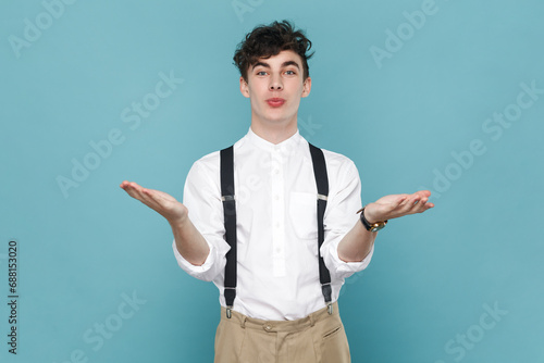 Portrait of funny positive handsome man wearing white shirt and suspender raised his palms, take it for free, looking at camera. Indoor studio shot isolated on blue background.