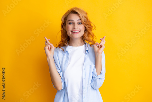 Portrait of funny woman with crossed fingers for good luck, isolated background. Headshot of glad woman crosses fingers with positive expression, believes in good luck and success.