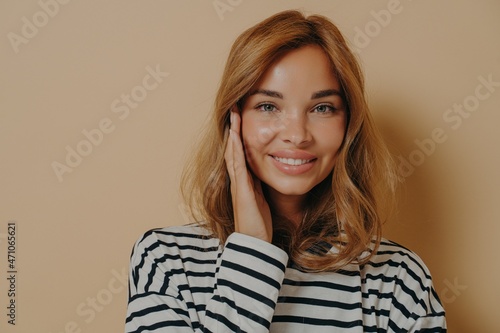 Portrait of good looking young woman touches face gently smiles toothily looks directly at camera