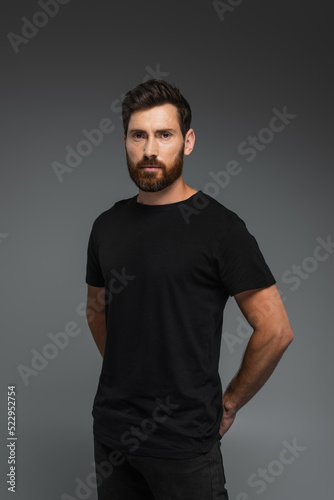 portrait of good-looking man in black t-shirt looking at camera isolated on grey.