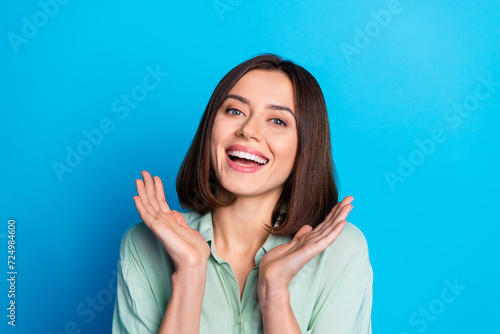 Portrait of gorgeous lovely girl with stylish hair wear teal shirt palms demonstrate white toothy smile isolated on blue color background