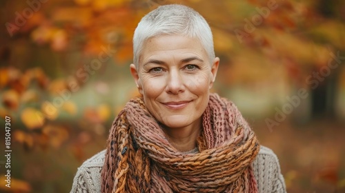 Portrait of hairless woman with alopecia standing on fall forest background exudes hope