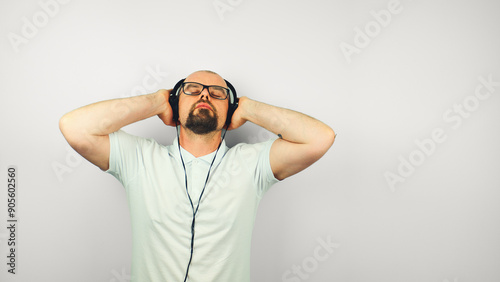 Portrait of handsome bearded man with glasses in white shirt, enjoying listening the music on headphones, lifestyle, isolated on white background