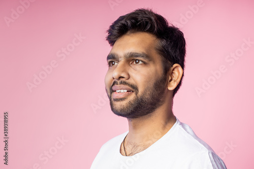 Portrait of handsome Indian guy standing on pink background