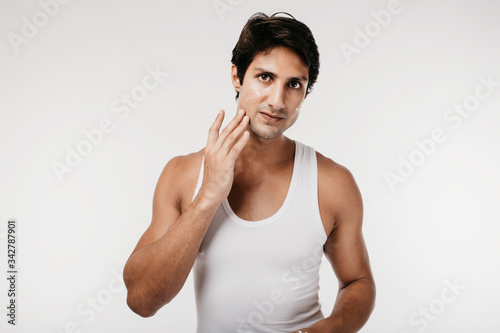 Portrait of handsome man applying cream skin care on his face, looking at camera and smiling Enhance casting, on a white background