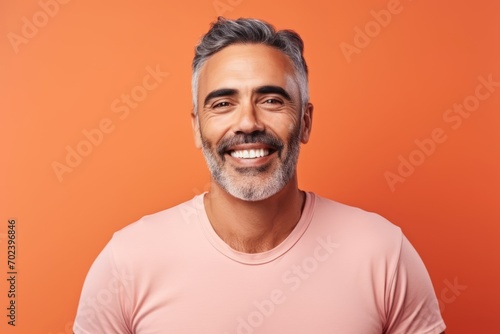 Portrait of handsome middle-aged man smiling at camera while standing against orange background