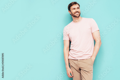 Portrait of handsome smiling stylish hipster lambersexual model. Sexy man dressed in pink T-shirt and trousers. Fashion male isolated on blue wall in studio