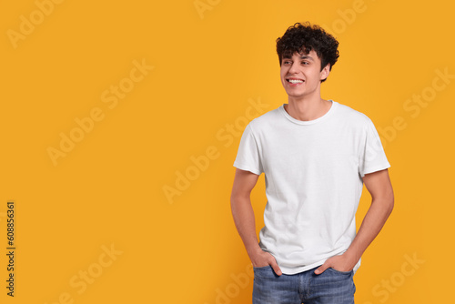 Portrait of handsome young man on orange background. Space for text