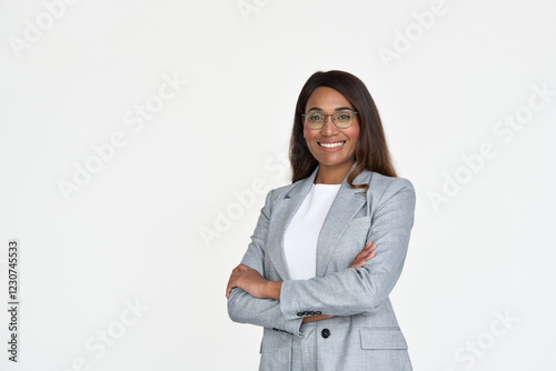 Portrait of happy African American business woman, smiling businesswoman leader executive wearing grey suit and glasses standing arms crossed isolated on white background.