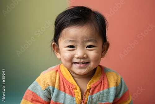Portrait of happy asian baby in color clothing on color background. Generative Ai.