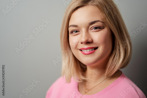 Portrait of happy blonde woman smiling and looking at camera on grey background.
