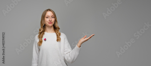 Portrait of happy blonde young woman, pointing hand right and showing at promo offer, advertisement, stands in white sweater against gray background. Mock up copy space
