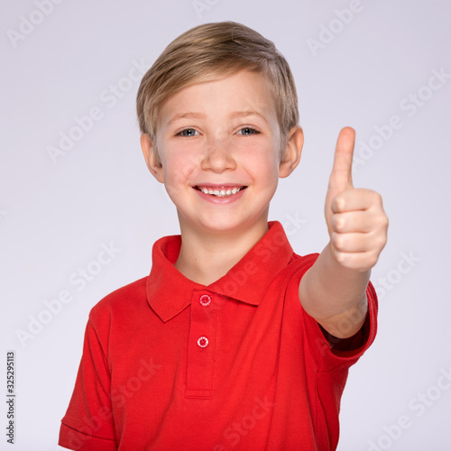 Portrait of happy boy showing thumbs up gesture, isolated over white background. Portrait of white smiling kid in a red t-shirt with a big thumb up. Boy with a positive emotions posing at studio.
