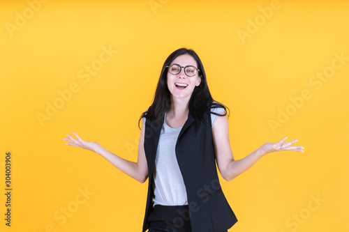 Portrait of happy businesswoman smiling in dark suit on yellow background using as professional modern business people and office concept.