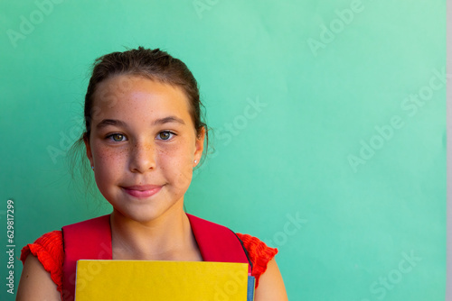 Portrait of happy caucasian schoolgirl with books over blue background