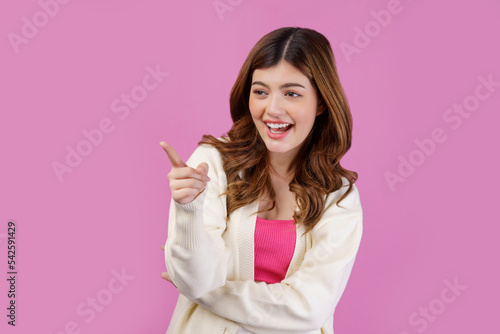 Portrait of happy cheerful young woman pointing to empty copy space for product over isolated pink background