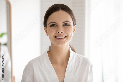 Portrait of happy female spa salon customer, beauty blogger, hotel guest wearing white bath robe. Head shot of beautiful young women relaxed after spa procedures, looking at camera and smiling.