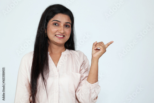 Portrait of Happy Indian woman pointing finger to empty space and wearing traditional ethnic dress with facial expressions on white background, Advertisement and promotion.