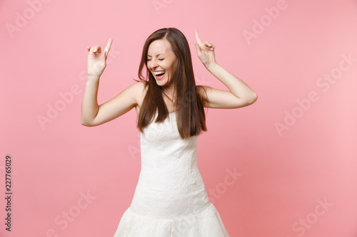 Portrait of happy laughing bride woman with closed eyes in white wedding dress dancing pointing index fingers up isolated on pink background. Wedding celebration concept. Copy space for advertisement.