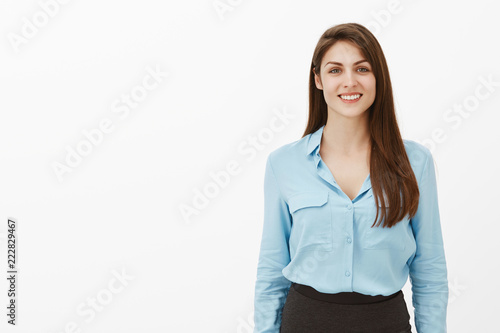 Portrait of happy outgoing european female entrepreneur in blue blouse and black skirt, smiling broadly and gazing at camera, being ready to help or give advice, standing carefree over grey wall