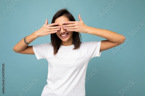 Portrait of happy positive young beautiful brunet woman with sincere emotions wearing casual white t-shirt for mockup isolated on blue background with empty space and covering eyes with hands