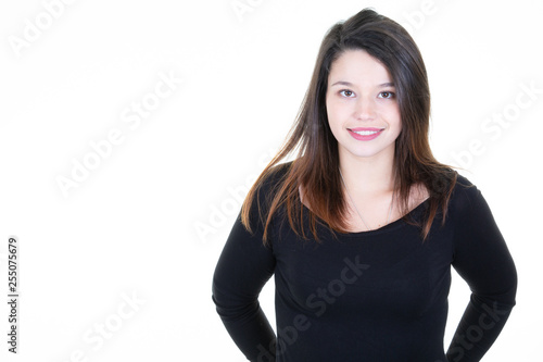 Portrait of happy smiling young beautiful woman isolated over white background. Looking at camera with free copy space for text