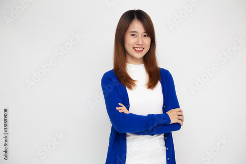 Portrait of happy young asian woman with arms crossed and smile isolated over white background