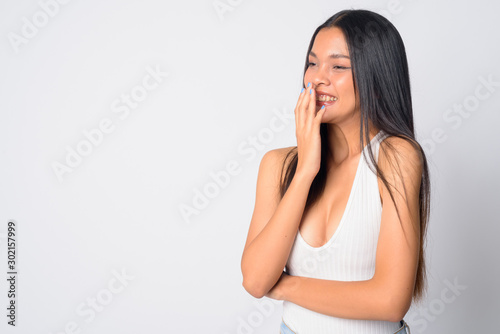 Portrait of happy young beautiful Asian woman laughing and covering mouth