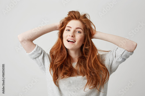 Portrait of happy young beautiful redhead girl smiling looking at camera touching hair over white background.