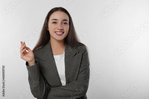 Portrait of happy young woman in stylish jacket on white background. Space for text