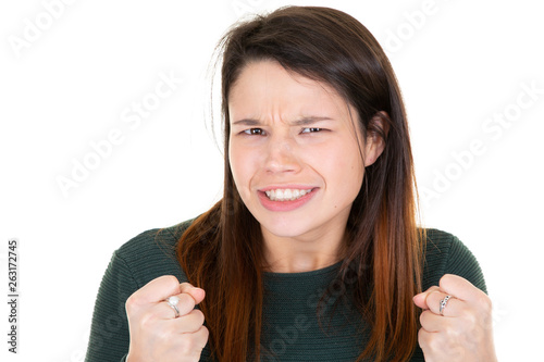 portrait of happy young woman looking funny angry in camera